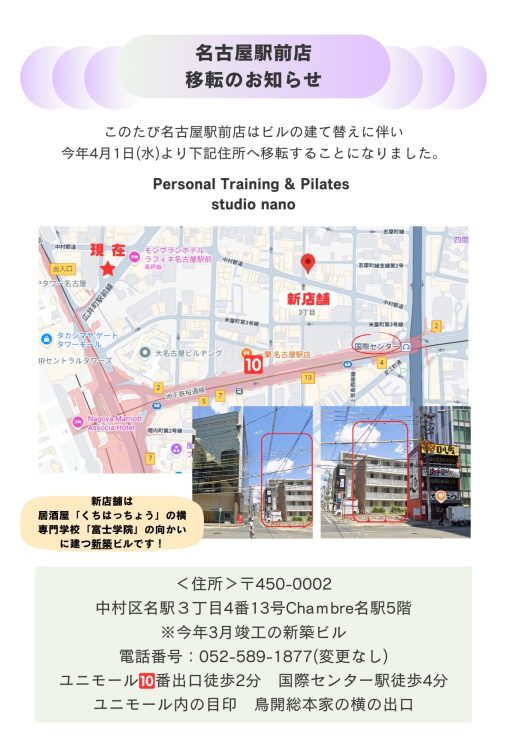 スタジオnano名古屋駅前店は、現在のビルの老朽化により、今年4月1日(水)より新店舗へ移転いたします。